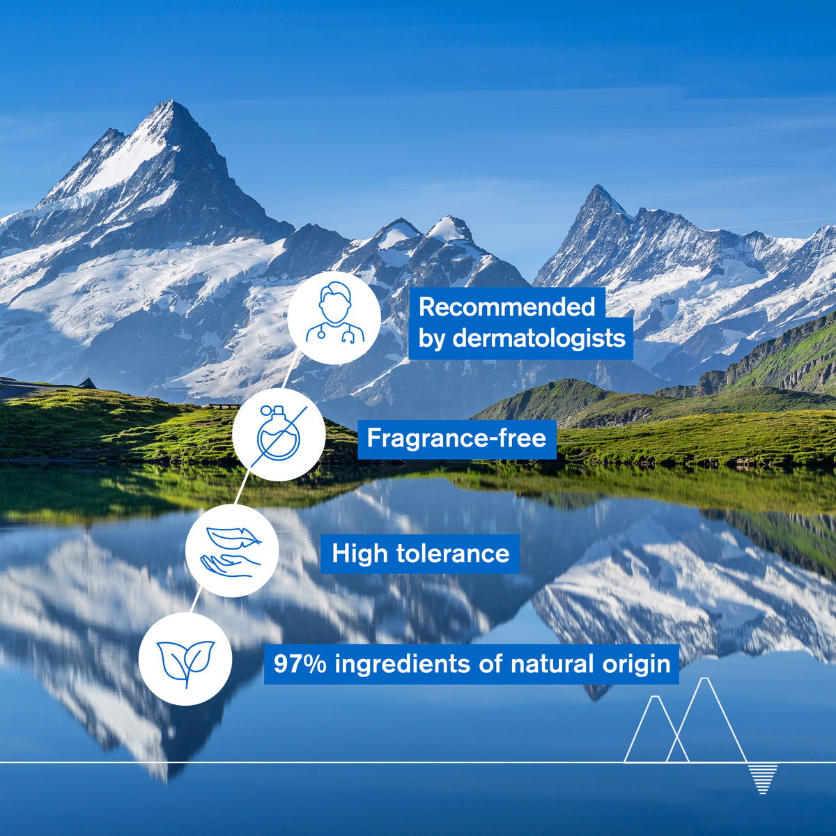 Unscented. High Tolerance. Ultra-fluid fresh texture. Dermatologically tested.