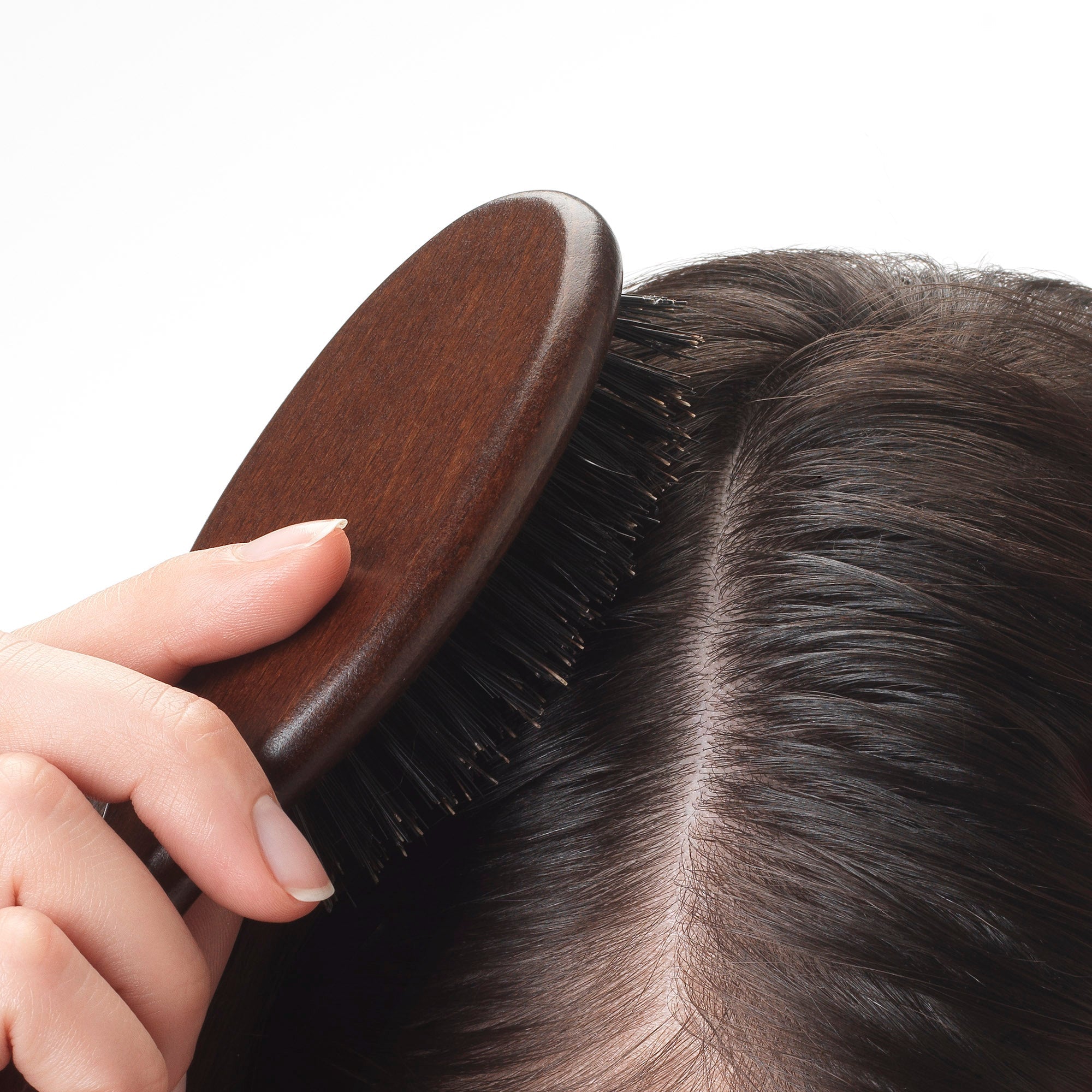 Spray dry shampoo onto roots to perk up hair between washes. Blend any residue into the roots. Volumise. Use a slim hair brush to further help work the formula into your hair.