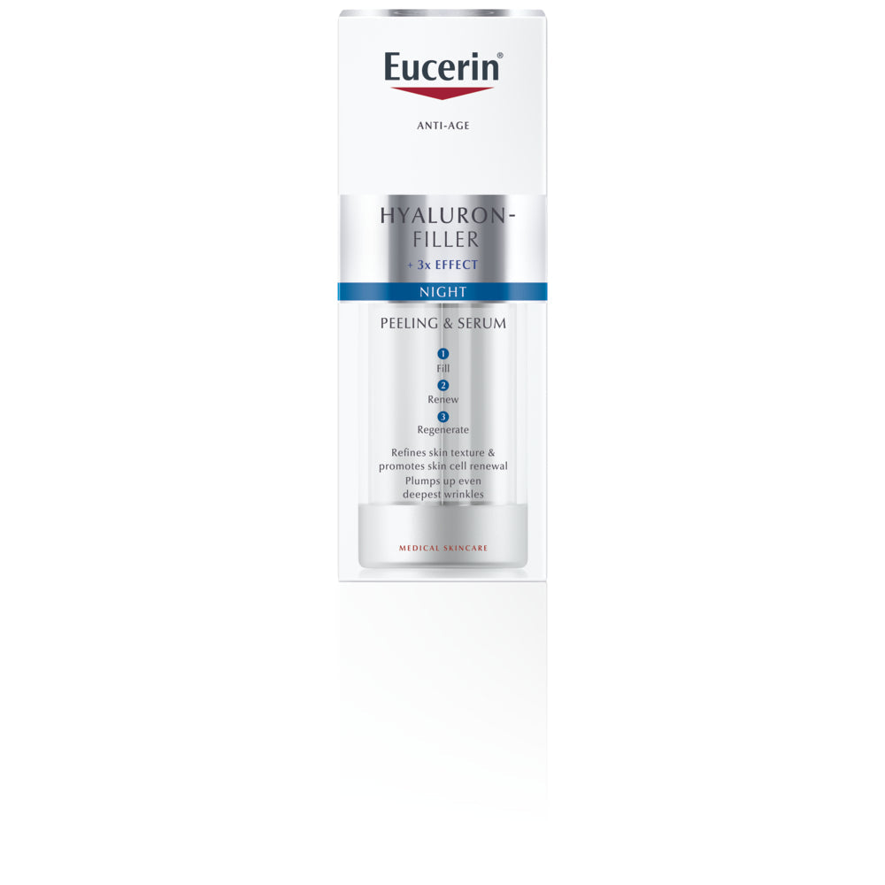 * Apply once a day, in the evening, to a well cleansed face, neck and décolleté * Press the top of dispenser in the middle to release the optimum combination of both formulas * Mix the two formulas together in the palm of your hand * Avoid direct contact with your eyes * The product may increase skin’s sensitivity to the sun so ensure you use a minimum SPF 30 day cream every day after using the product and for a week after use * For best results, use in combination with other products in the Eucerin Hyaluron-Filler range