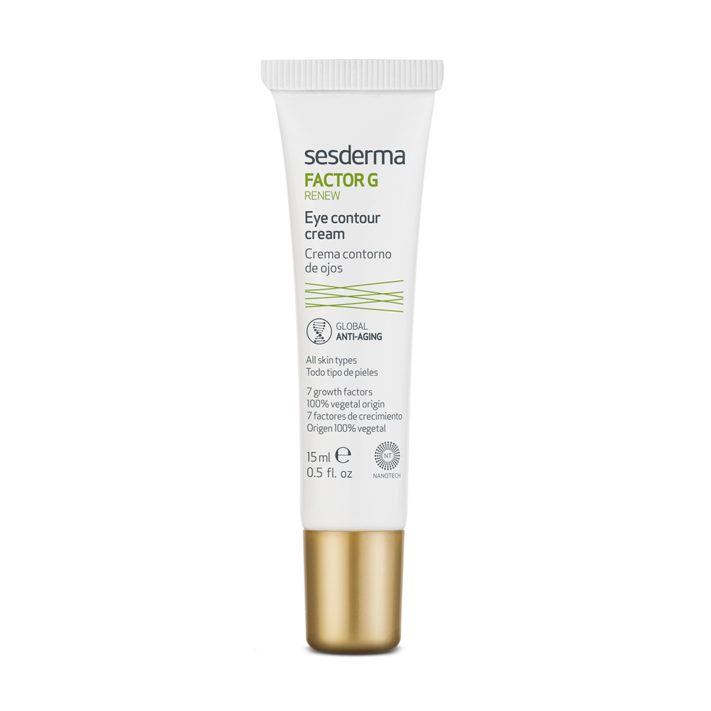 Anti-aging cream for the eye contour area, formulated with biotechnology. 7 growth factors of plant origin, to reactivate the skin's regeneration mechanisms and a complex of active ingredients that act on dark circles. Factor G Renew multiplies the synthesis of collagen and elastin by 3, to reduce wrinkles.