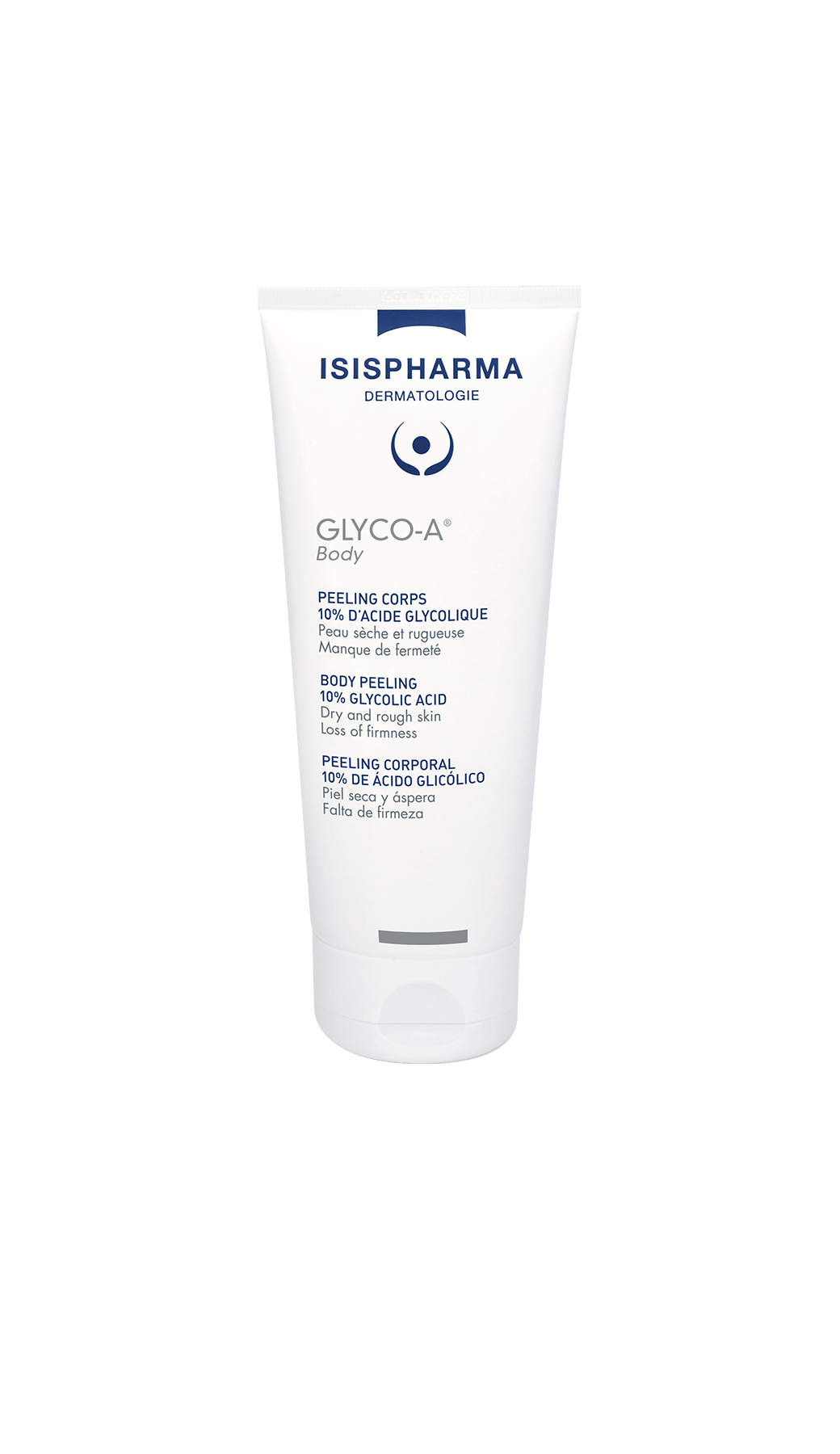 Body peeling with 10% glycolic acid, used for dry and rough skin, scales, loss of firmness. AHAs have renovating power: softens and tones (glycolic acid + lactic acid), moisturizes and nourrishes (shea butter), protects and repairs the skin barrier (Amino acids extracted from oats + Plant-derived squalane). Eliminates dryness scales.