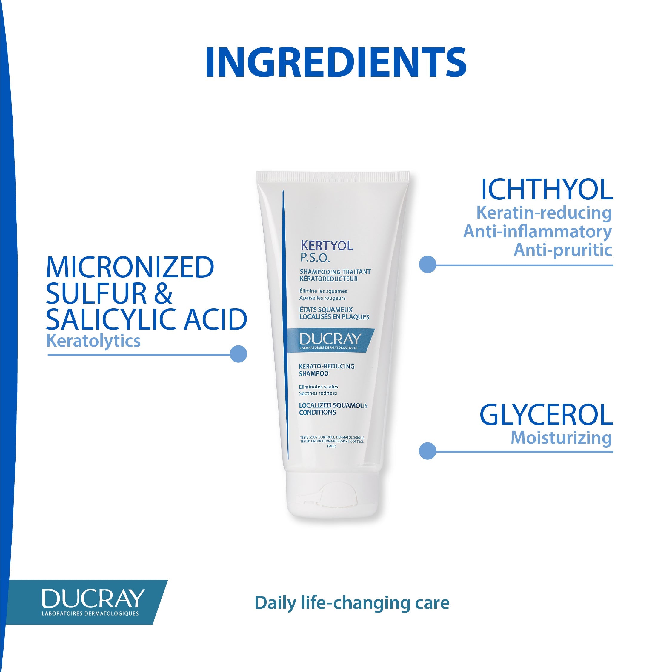 Kerato-reducing, eliminates adherent flakes and soothes rednessRed plaques covered with relatively thick scales appear on the scalp. This shampoo helps eliminate scales and soothe redness and itching.
