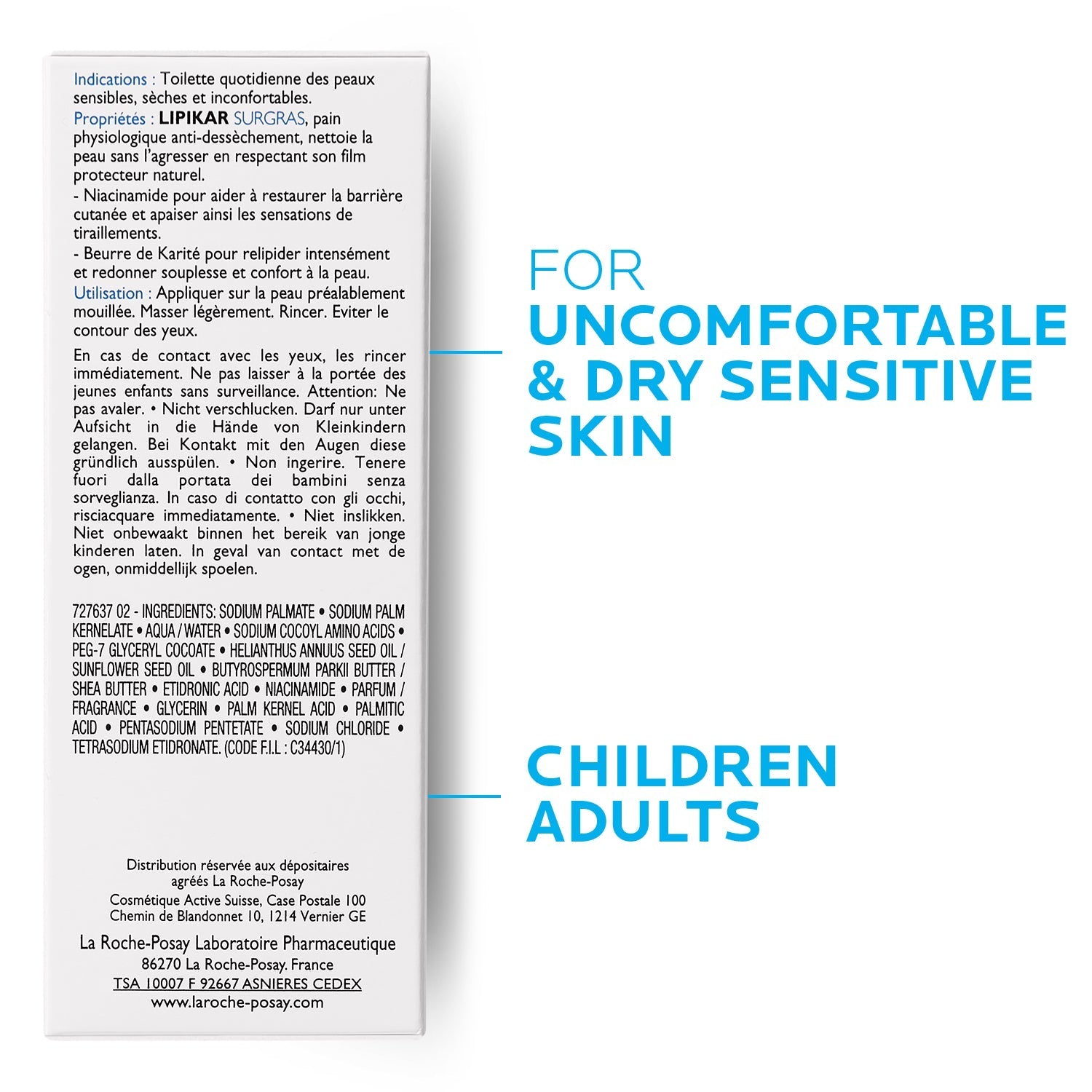 •Lipid-enriched moisturising cleansing bar gently cleanses the skin and provides essential lipids to dry skin to help maintain the skin's natural protective layer.\n•Shower after shower, the skin is preserved from all sensations of tightness and keeps its natural softness and comfort daily.\n•Tested on sensitive skinEnriched with Niacinamide and a lipid-replenishing concentrate, LIPIKAR PAIN SURGRAS soothes irritations and protects your skin against the drying effects of water.