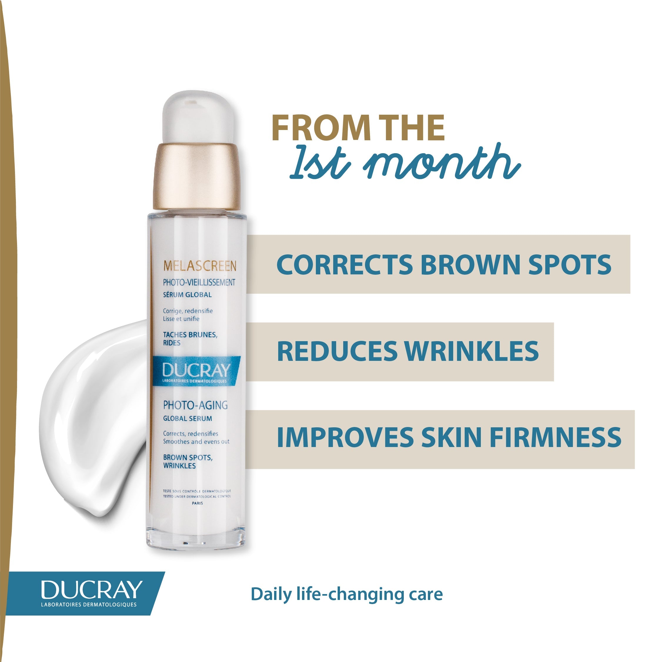 Sun-induced skin aging: combination of brown spots, wrinkles and loss of firmness in the skinSkin is redensified and regains all its radiance. Wrinkles and brown spots are reduced.