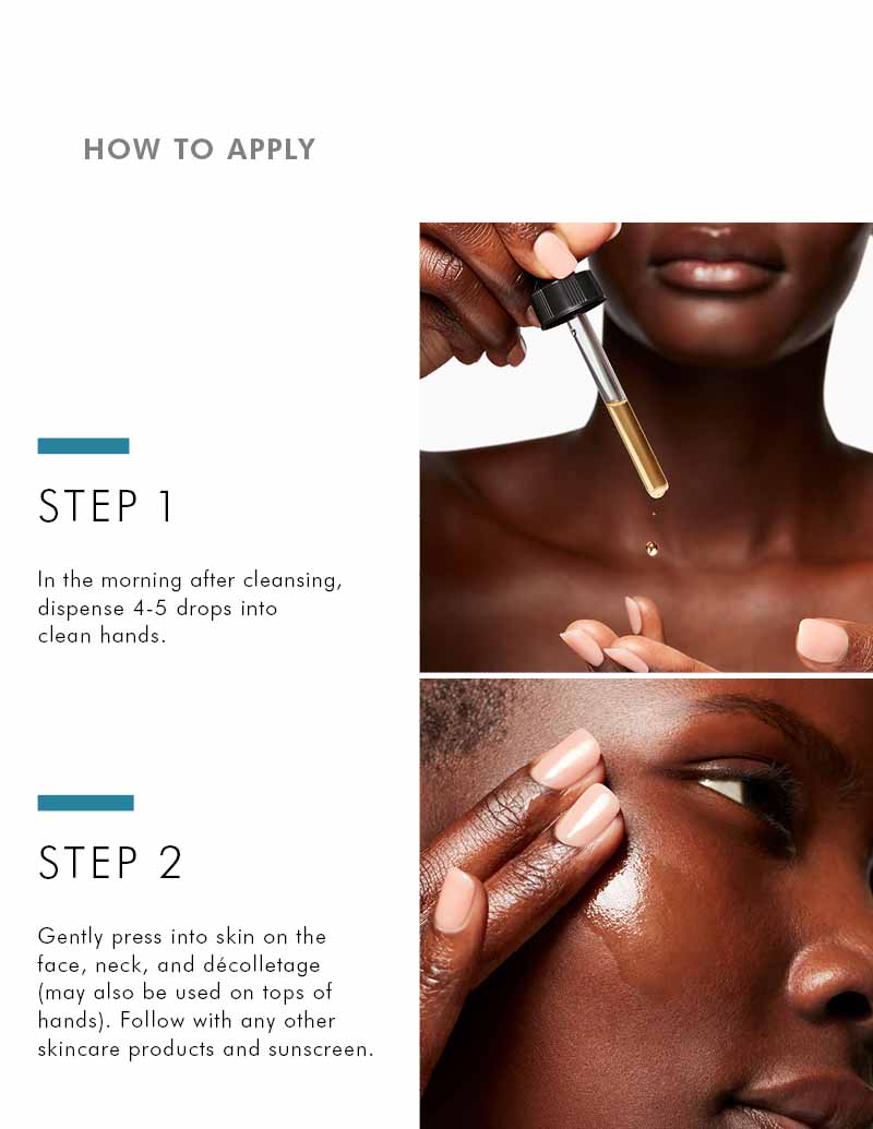 In the morning after cleansing and toning, apply 4-5 drops to a dry face, neck, and chest before other skincare products. May be used on the back of the hands. It is normal for vitamin C products to darken after opening due to air and light exposure. The formula will remain effective. Once opened, it is recommended to be used within 3 months of opening