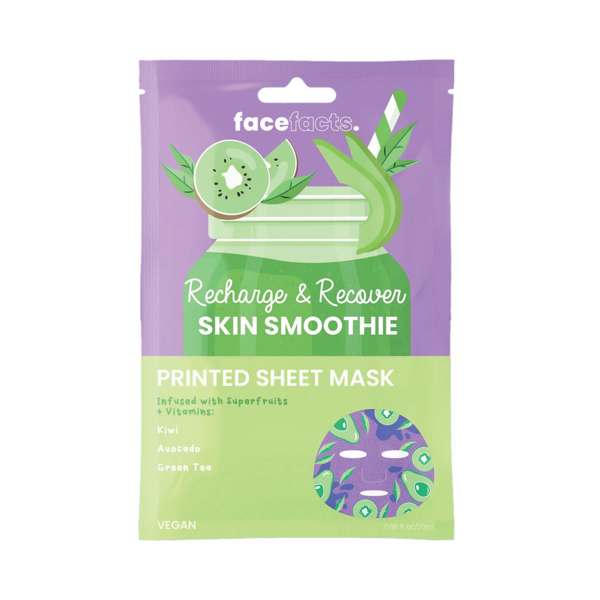 Infused with a rich blend of Superfood ingredients and Vitamins to Recharge & Recover your skin. Our Printed Sheet Mask is bursting with Avocado, Kiwi and Green Tea Leaf Extracts, which help to rejuvenate your complexion, leaving skin feeling nourished, soothed, and hydrated. The perfect Vegan smoothie your skin is craving.