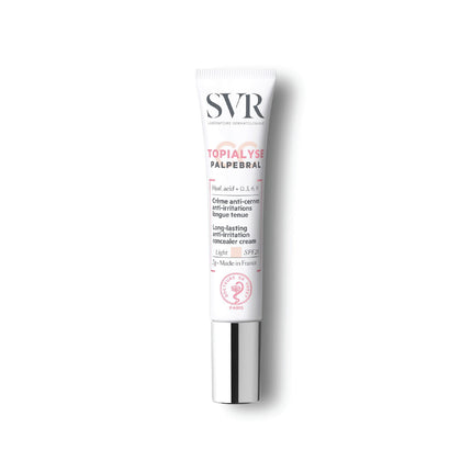 SVR Topialyse Palpebral CC Light Tone -7g is the first concealer cream for hypersensitive eyelids and eye contours that corrects and conceals irritation, redness and dark circles. This product moisturizes and provides coverage for 12 hours, while soothing the skin and preventing itching. Plus, it has mineral solar filters that provide an SPF 20 and limit the appearance of hyper-pigmented dark circles.
